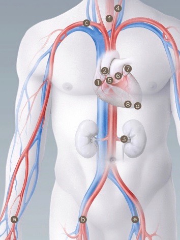 1 coronary arteries (balloon dilatation / stenting), 2 aortic valve (TAVI), 3 renal artery, 4 carotid artery